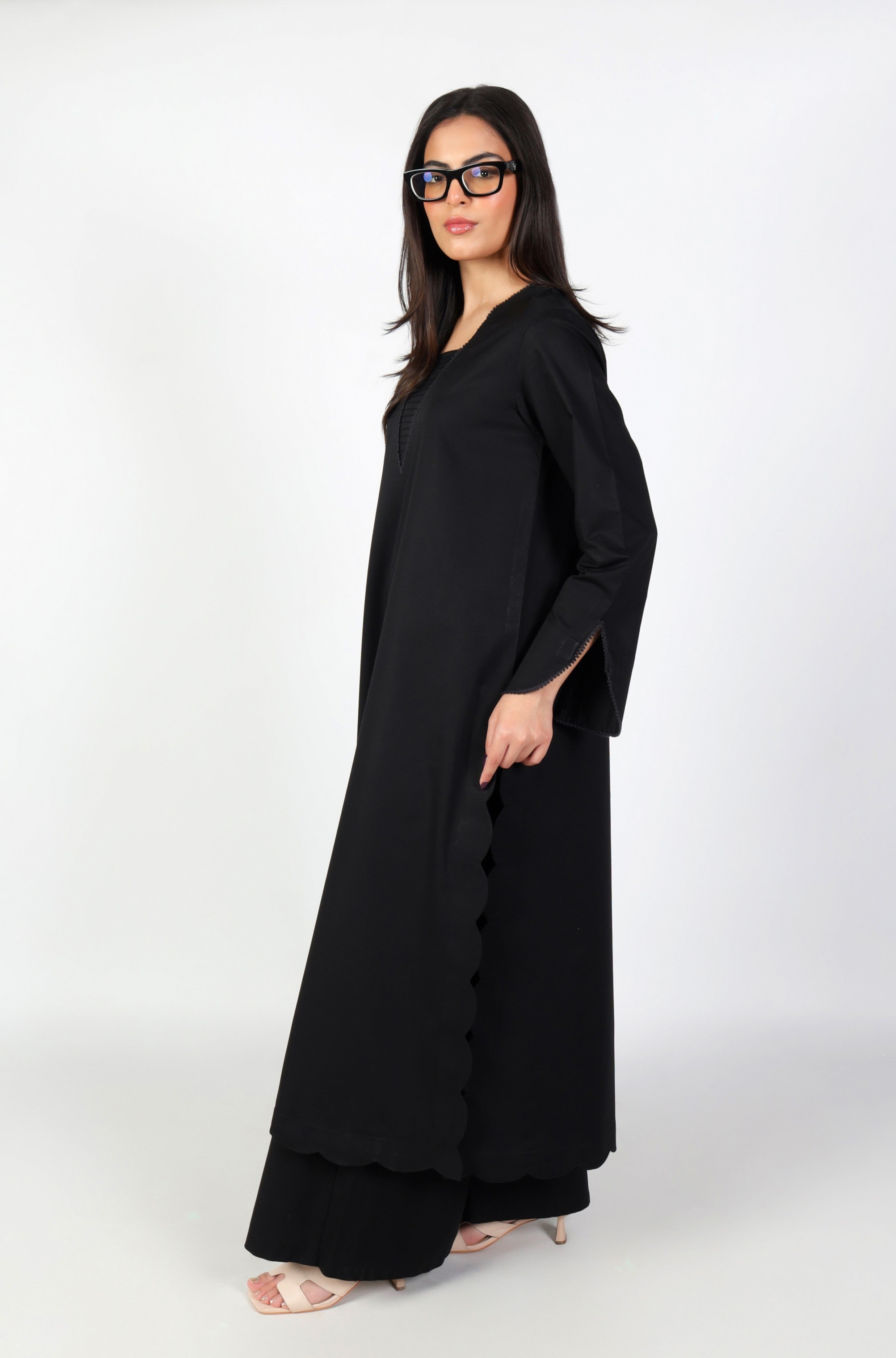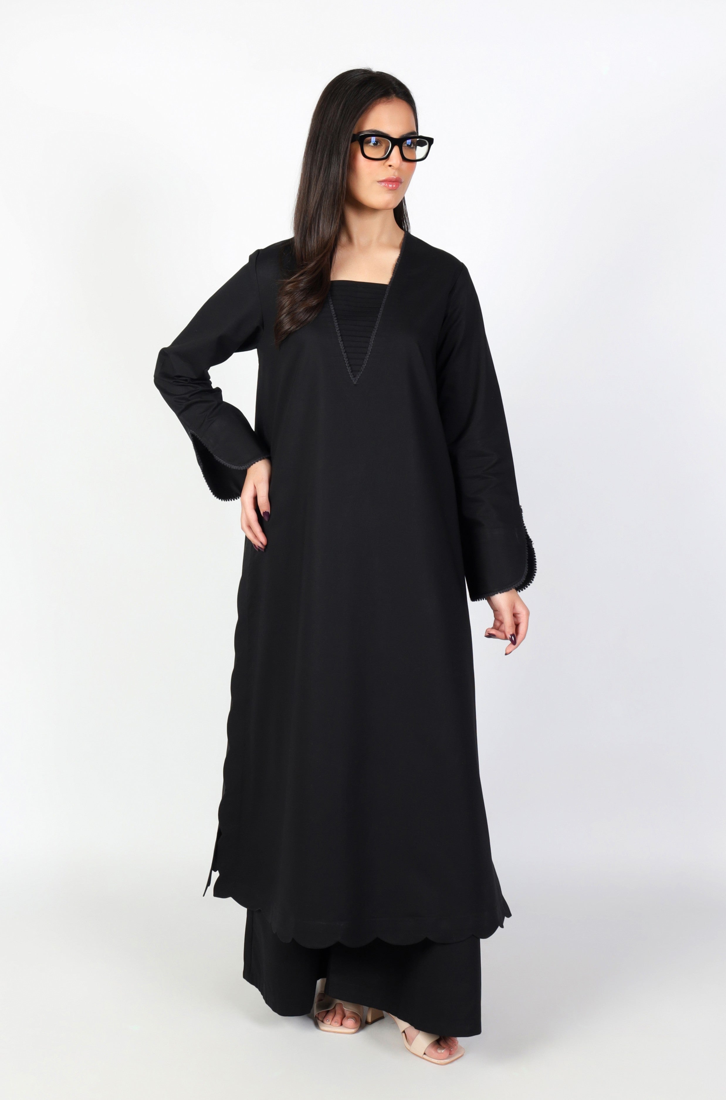 THIS BLACK LONG LENGTH SHIRT PRESENTS A REFINED SILHOUETTE. FINISHED WITH A SCALLOPED HEM AND SIDE SLIT THAT ADDS A DELICATE EDGE. THE V-NECKLINE IS ENHANCED WITH FINE PLEATED DETAILING. THE SLEEVES FEATURE A GENTLE CUT. PAIRED WITH FLARED CULOTTES, THE ENSEMBLE OFFERS A MODERN LOOK WITH EFFORTLESS SOPHISTICATION