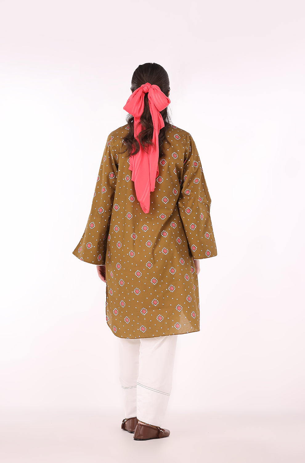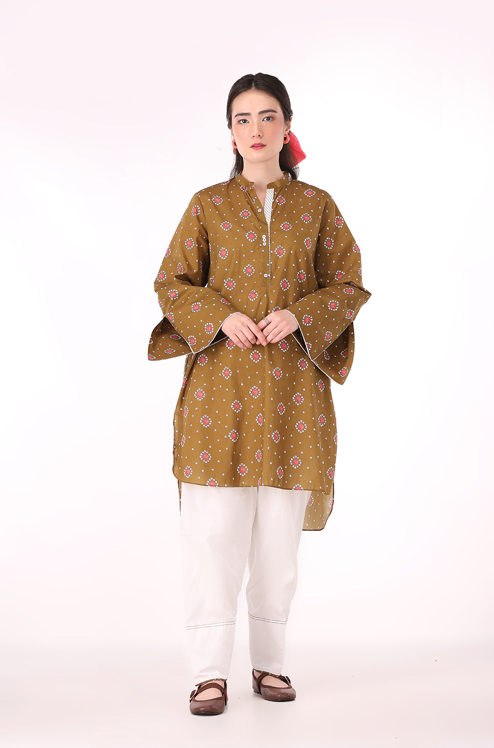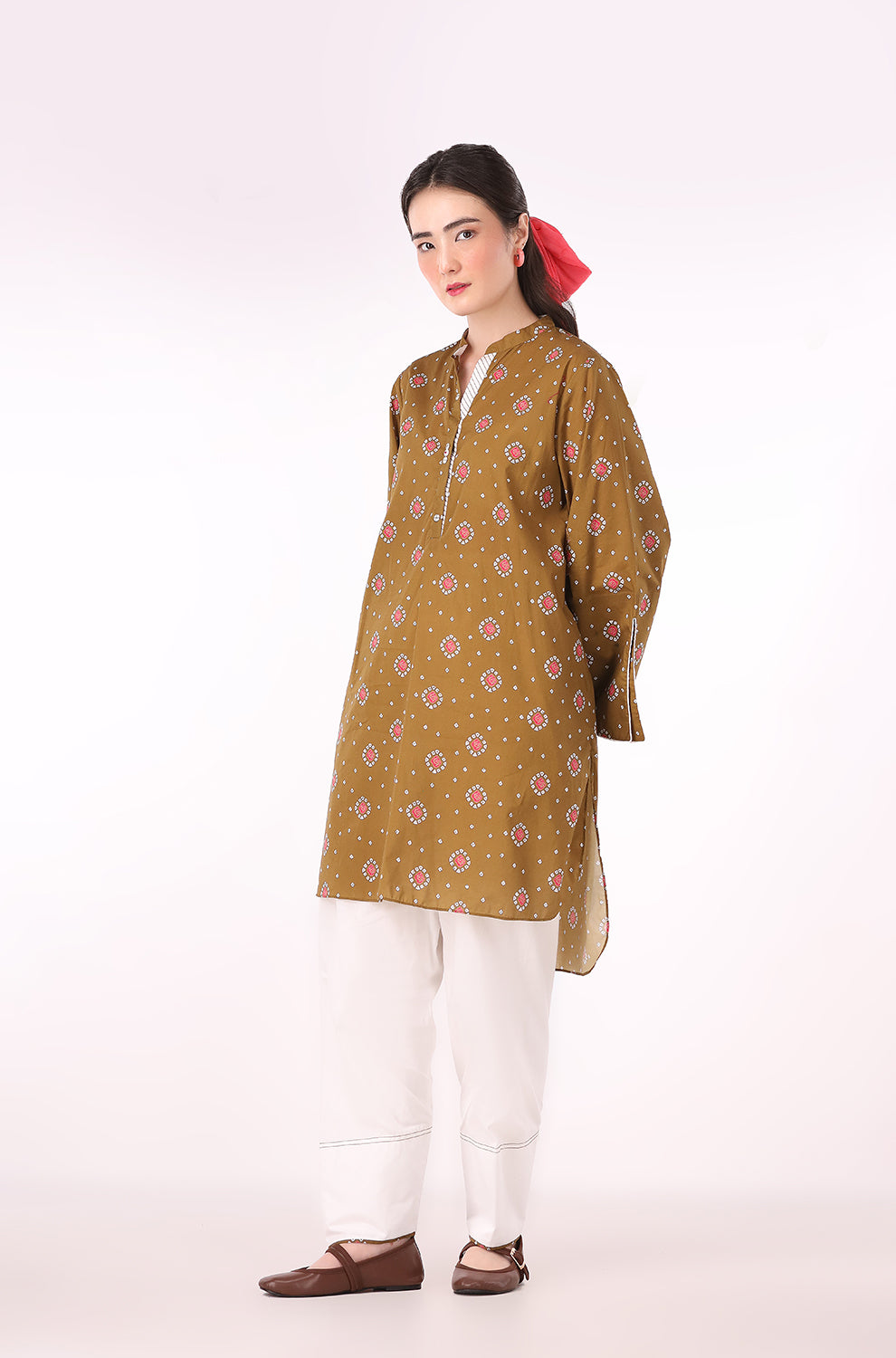 Embrace a vibrant aesthetic with this lawn ensemble, featuring a unique olive base and a stylized sunburst print that radiates a vintage, old-school vibe. The loose-fit kurta is designed with a high-low hem and side-slit sleeves, accented by classic white piping. Paired with contrasting white shalwar. this look offers the perfect balance of nostalgic appeal and modern.