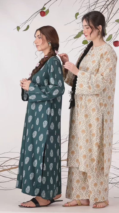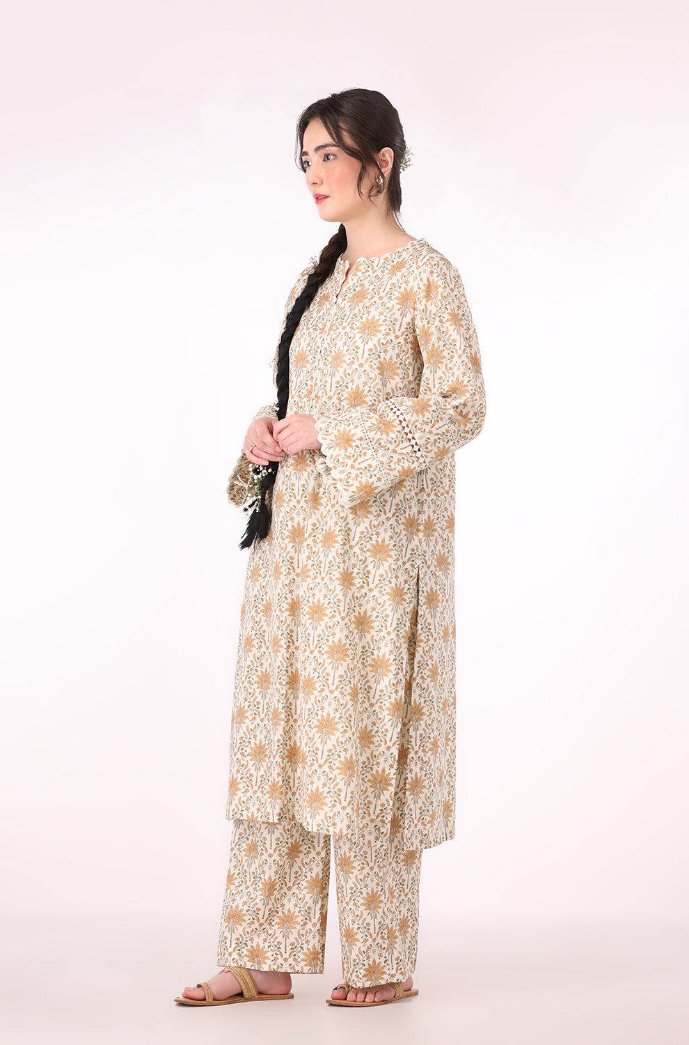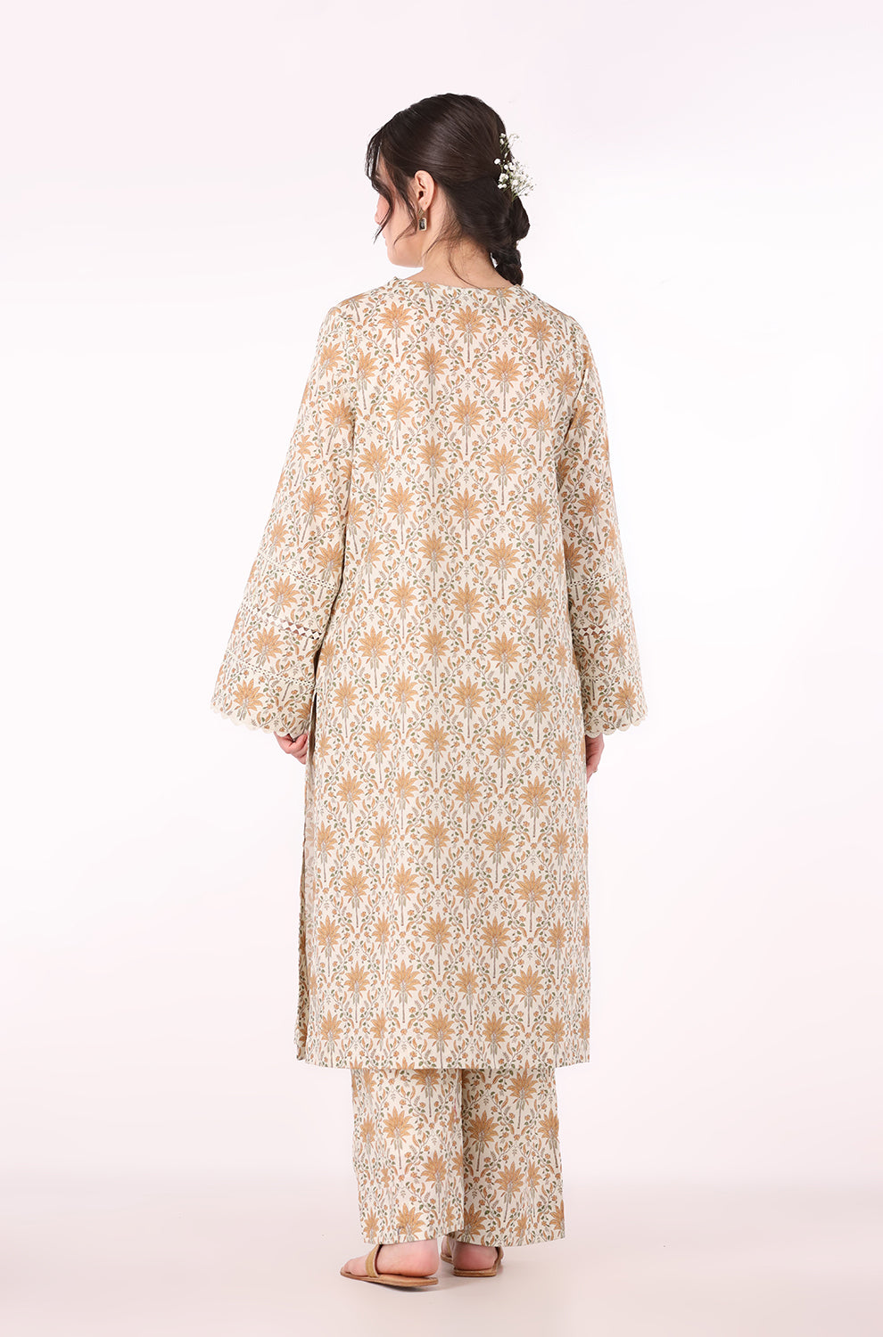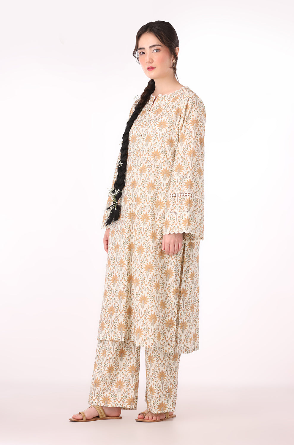 Radiate timeless elegance with this premium two-piece lawn ensemble, featuring a sophisticated all-over botanical print in warm, neutral tones. The straight-cut shirt is designed with a scalloped lace neckline and i lace detailing on a sleeves . Paired with wide-leg trousers. this breathable and lightweight outfit offers a perfectly polished silhouette.